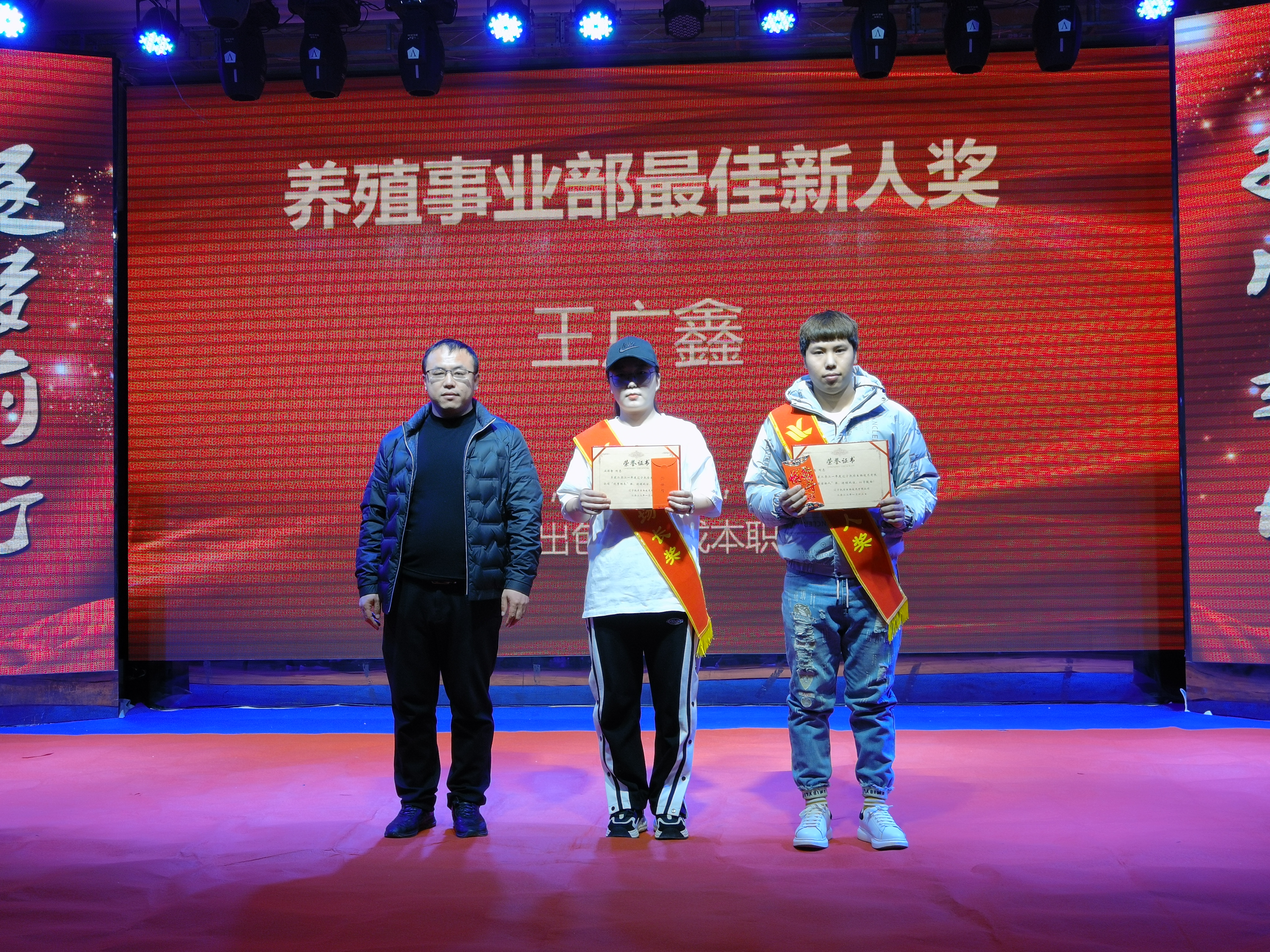 叢林智、王廣鑫獲得2021年度優(yōu)秀場長、最佳新人獎。叢林智工作積極努力,技術(shù)精湛。能吃苦,肯鉆研,使凱豐養(yǎng)殖小區(qū)的出欄成績大幅度提升。并且創(chuàng)造凱豐養(yǎng)殖小區(qū)歷史最高歐值410以上,利潤單只最高。王廣鑫踏實(shí)肯干,勤奮好學(xué)。協(xié)助場長出色的完成本職工作。得到領(lǐng)導(dǎo)和同事的一致的高度好評。公司養(yǎng)殖場總經(jīng)理劉迪為獲獎?wù)?/span>頒獎